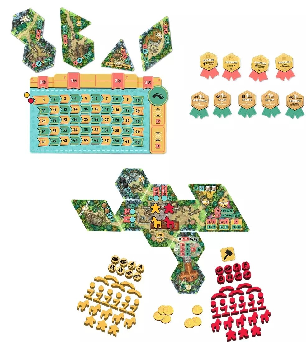 32 ressources transformées, 24 marqueurs ronds, 24 Drapeaux, 16 Villageois, 20 routes, 24 Ânes, 18 matières premières, 1 jeton Masse, 30 pièces d’or, 6 parties de l’Église, 9 tuiles Niveau de maitrise & Distinction, 12 Commandes du Marché, 32 tuiles Village, 1 plateau de score, 1 sac en tissu, 1 plateau Action Solo, 1 tuile Faveur, 5 jetons Action, 2 livrets de règles