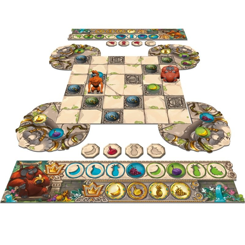 Via une mécanique de Stop ou Encore, vous tentez de récupérer un maximum de fruits dans le même tour. Vous pouvez continuer tant que vous voulez votre collecte, mais si 2 fruits identiques apparaissent, vous perdez tout ! Déplacez votre figurine de Monki sur le plateau afin d'explorer les 4 coins du Templeet en extraire votre butin.