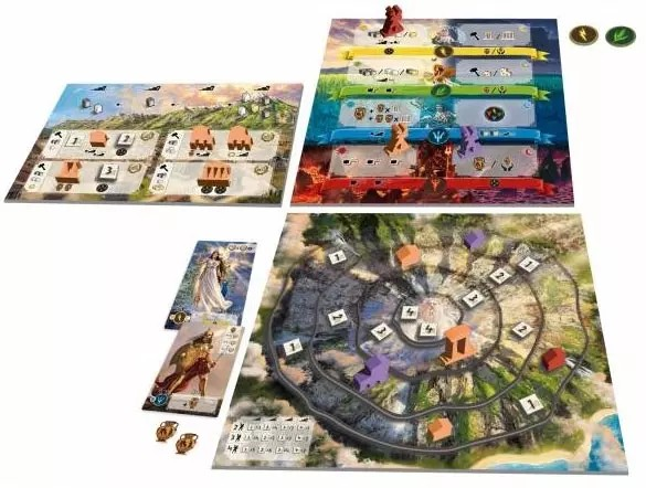 1 plateau Mont Olympe, 1 plateau Action, 4 plateaux individuels, 16 cartes divinités, 4 pions Bâtisseur, 12 petites cités, 8 grandes cités, 8 petits temples, 4 grands temples, 1 pion Joueur actif, 16 jetons Faveur, 17 jetons Niveau, 45 jetons Offrande, 6 jetons Cadenas, 105 cubes de ressources, 11 jetons 3 ressources, 1 livret de règles